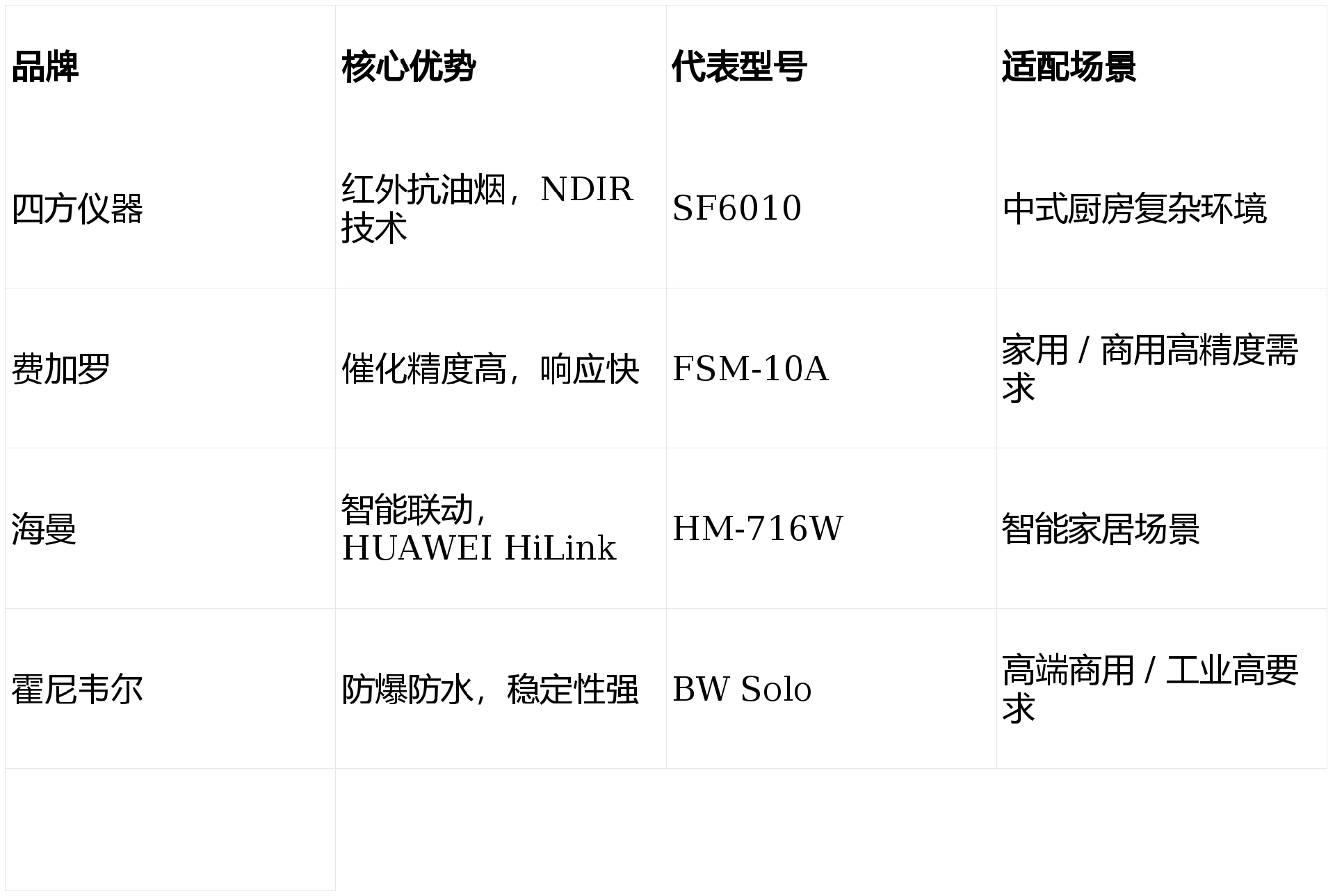 | 紅外(NDIR)| 約 10 年 | 強(qiáng)(IP65)| 高 | 中高 | 油煙大、潮濕廚房 |